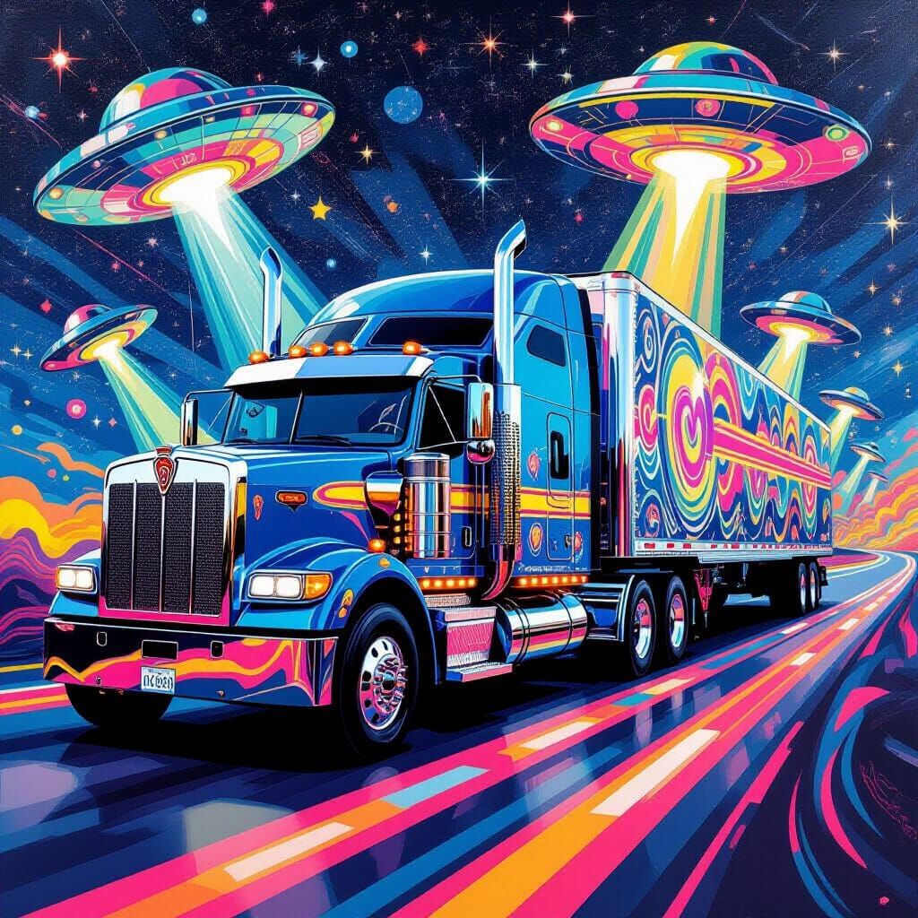 A surreal scene of a vibrant furry semi-truck driving on a paint road. Extraterrestrial UFOs fly above, all rendered in a psychedelic pop art style.