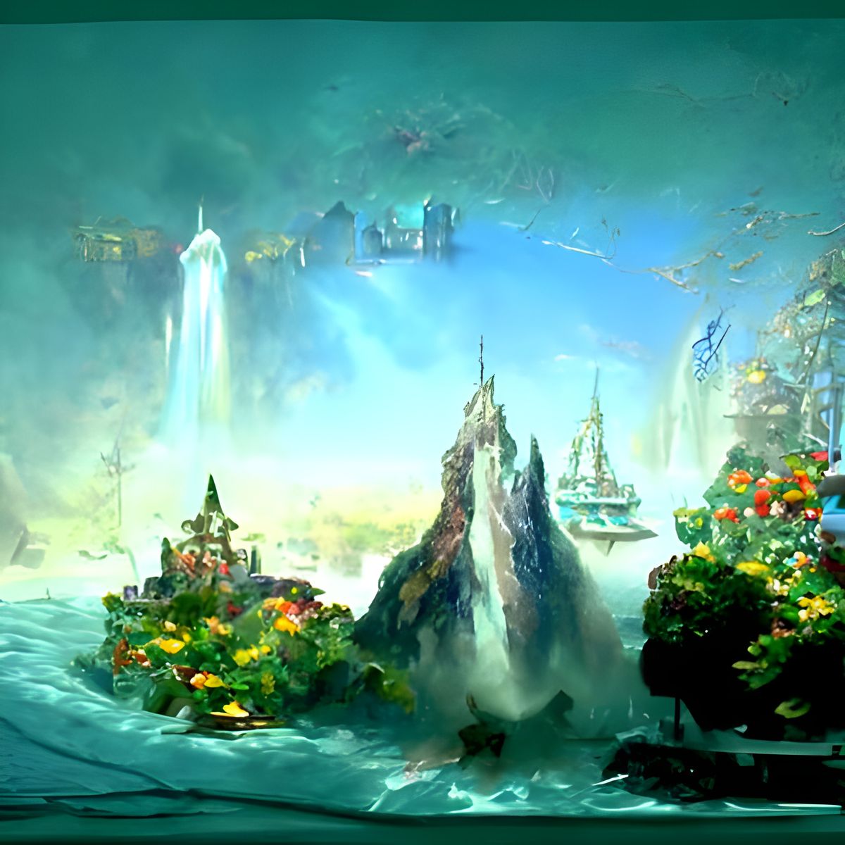 A hyperdetailed fantasy image of a mountain view overlooking the ocean, with the lost city of Atlantis beneath the sea near an ethereal waterfall. The artwork evokes the style of Thomas Kinkade.