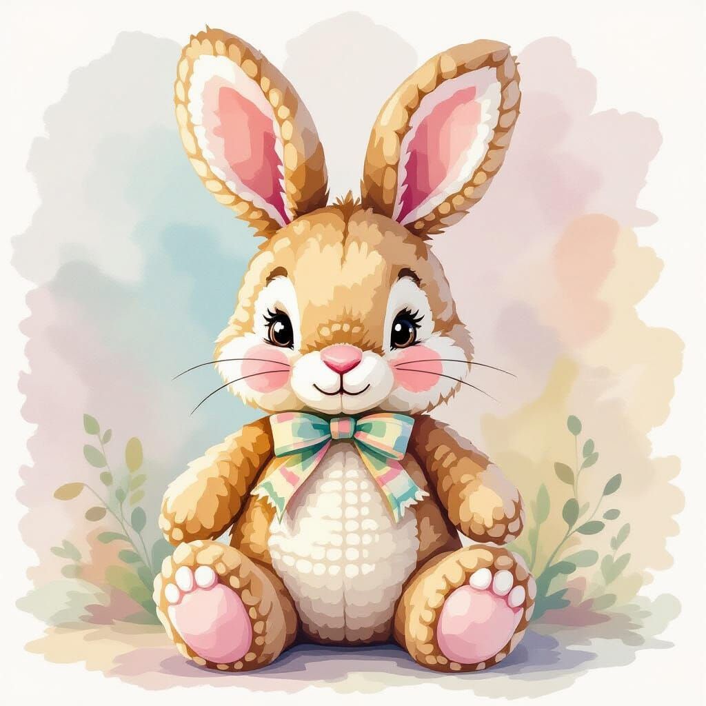 This image shows a charming crocheted bunny stuffed animal, rendered in a soft watercolor style with visible brushstrokes and pastel colors. It evokes a warm, handmade feel.