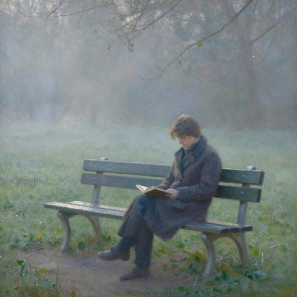 This image shows a lone person on a park bench at sunrise, captured in an impressionist style. Soft, blended brushstrokes and a muted palette evoke a peaceful, contemplative mood.