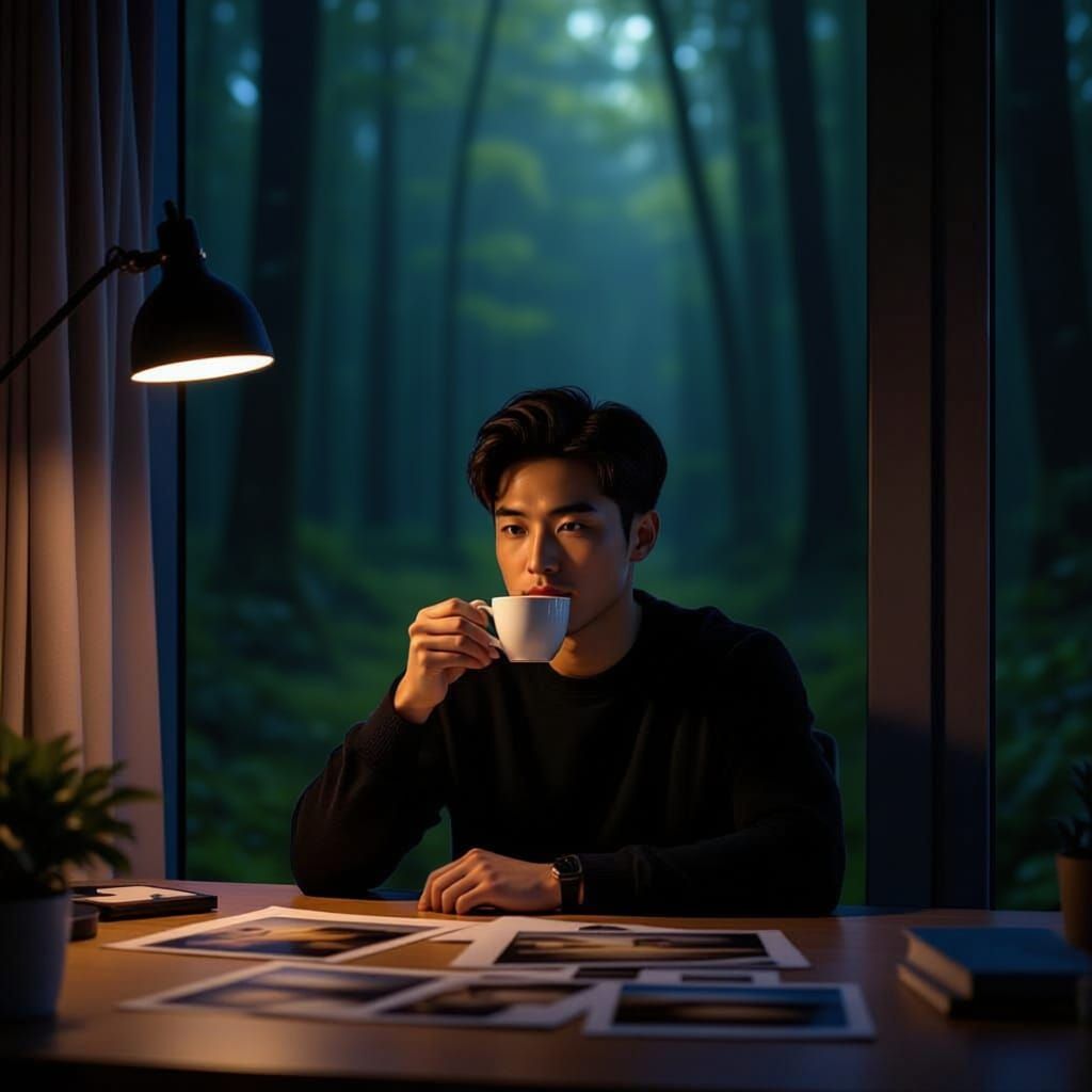 This image depicts a young man calmly sipping tea in his modern apartment. City lights twinkle outside his window at night, creating a peaceful urban scene.