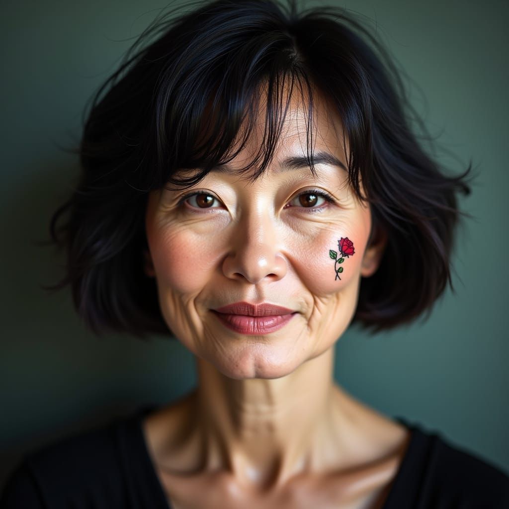 This image features a soft-focus portrait of a strong, rebellious 55-year-old Japanese woman. Her femininity is accentuated despite signs of aging, showcasing individuality and compelling eyes.
