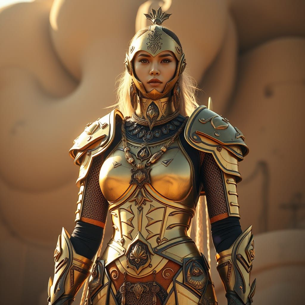 A majestic image of a golden armored woman standing tall, surrounded by intricate jewelry and warm sunlight, blending industrial and mystical elements in a striking visual style.