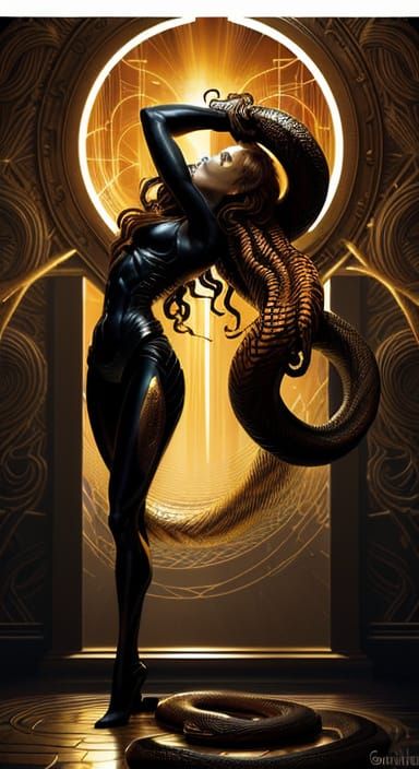 This image showcases a woman with coiled snakes for hair, standing strong and mysterious in a dramatic, golden-lit scene. Geometric elements and intense colors create a fantasycore atmosphere, reminiscent of a high-end oil painting.