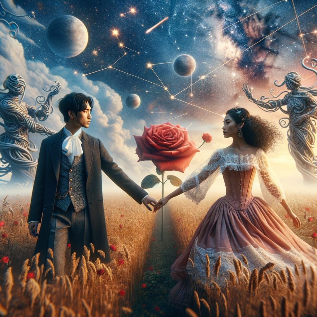 Visualize a scene straight from a romantic film as if it's portrayed within a surreal dreamscape. Picture two people, an Asian man with short black hair and a Hispanic woman with curly brunette hair, standing in an open field underneath a sky overrun by oversized constellations and planets. Both are ...