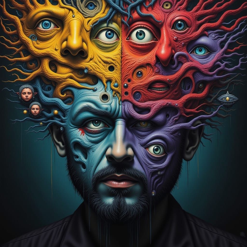 This image depicts a central contemplative face surrounded by many others expressing diverse emotions through color, in a dreamlike strangecore digital art style.