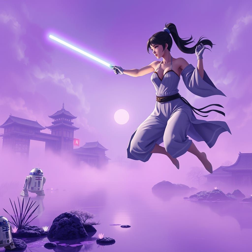 A vibrant anime-style image of a lightsaber-wielding woman in Japanese clothing leaping over city ruins. The scene features pastel colors, fog, and robots in an ultra-detailed, 8k resolution.