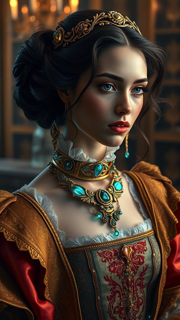 A striking picture of a woman in ornate Elizabethan clothing. The portrait features futuristic art-deco jewelry, high-contrast lighting and intricate details, rendered in a hyperrealistic digital art style.