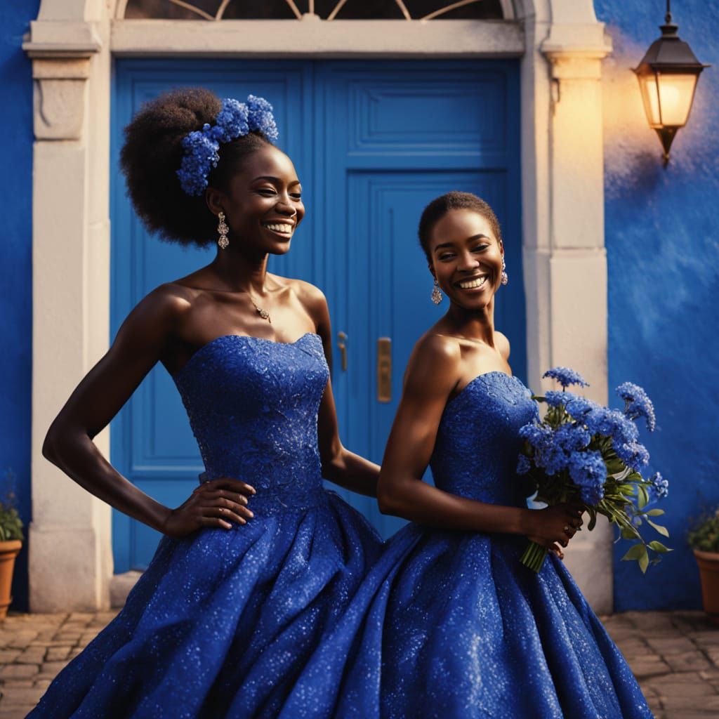 This image shows an African bride in a royal blue dress with a flower girl. The digital art features vibrant colors, neon accents, and a palette knife texture, reminiscent of a cinematic film still.