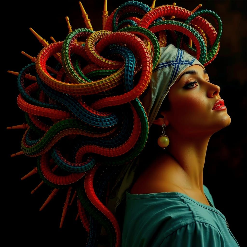 This hyperrealistic sculpture captures a vibrant woman in vivid RGB colors, symbolizing emotive introspection and psychological depth with intense detail.