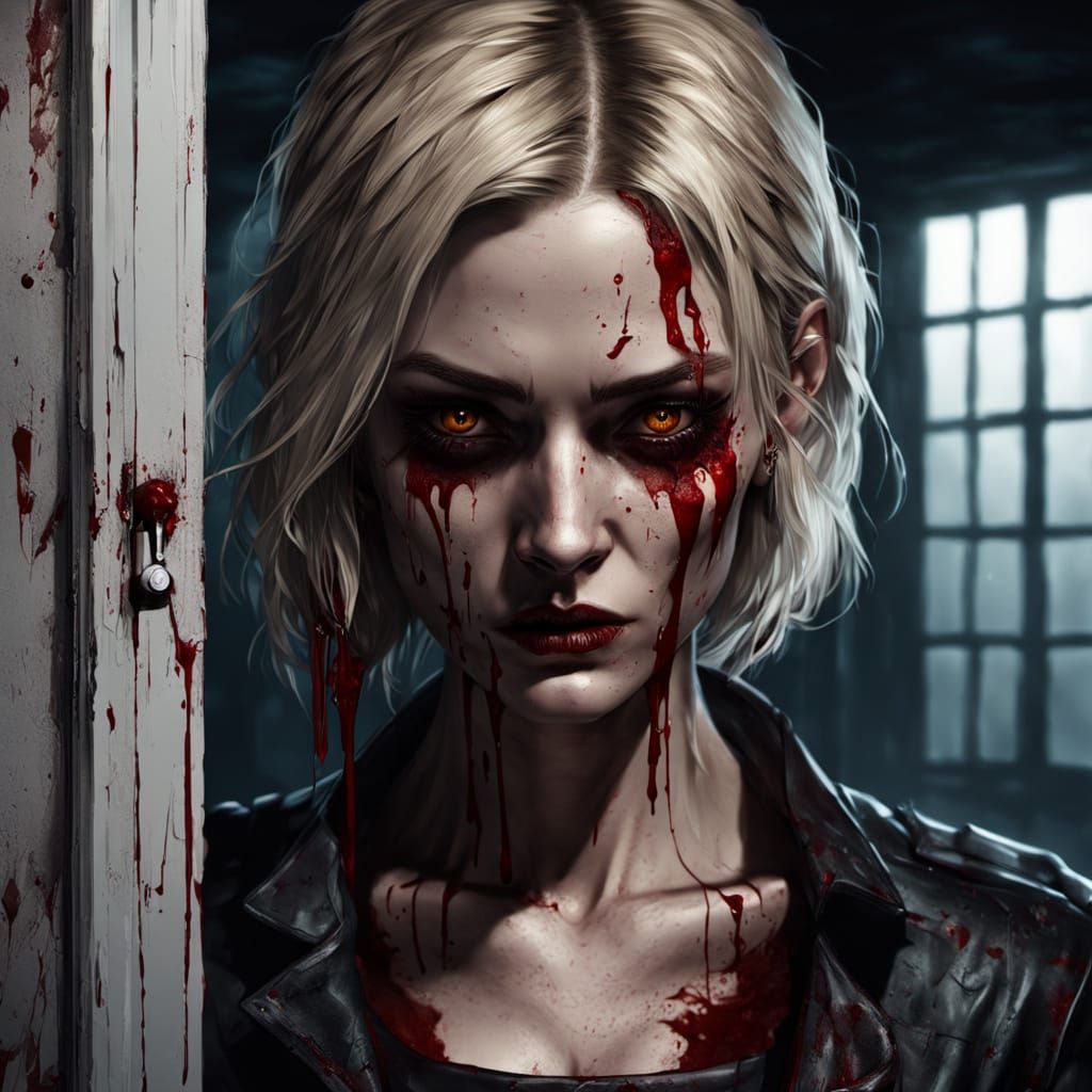 A hyperrealistic image of a blonde woman holding a bloody knife, peering through a doorway. The unsettling picture features manic red eyes, a creepy smile, and detailed textures in dark, muted colors.