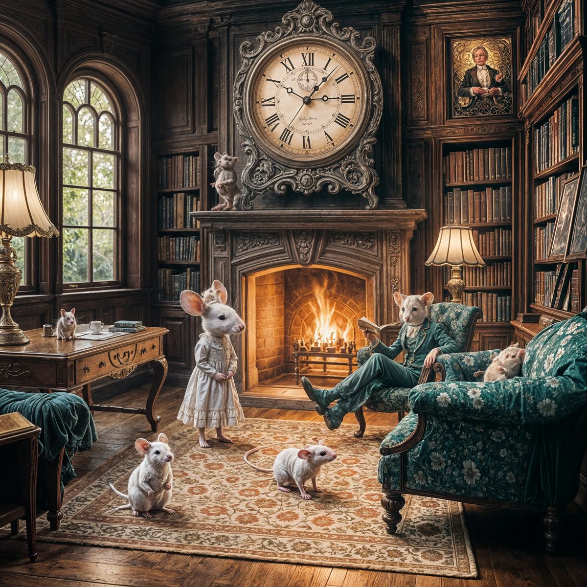 A serene Victorian library setting at night, with a professor reading by the fireplace, surrounded by opulent furnishings and artwork, while a finely dressed white mouse couple plays in the background