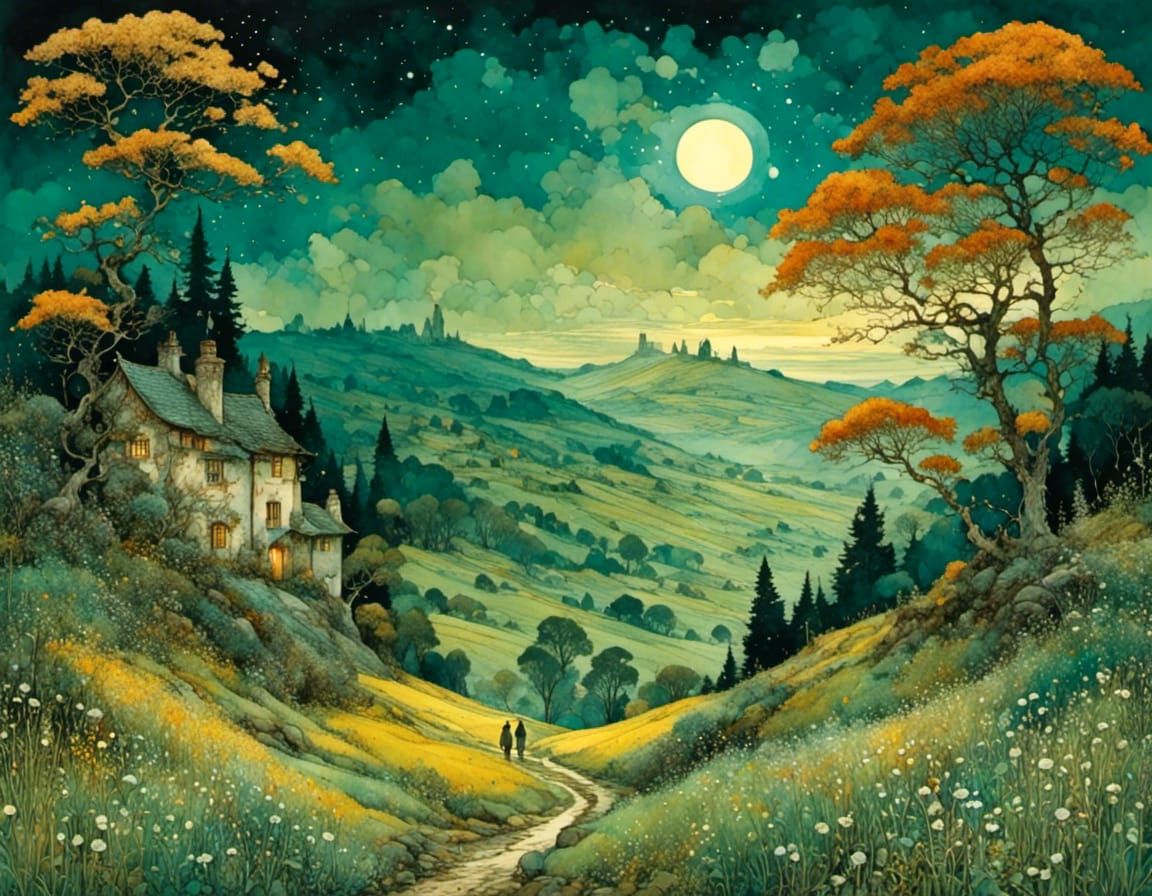 A vibrant landscape image featuring a serene vista. Triadic colors create a harmonious palette, reminiscent of classical paintings and illustrations from a bygone era.