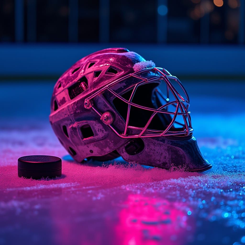 This image is a neon-lit, high-contrast depiction of a goalie helmet on an icy floor, with a puck beside it, capturing a sense of dynamic tension and futuristic style.