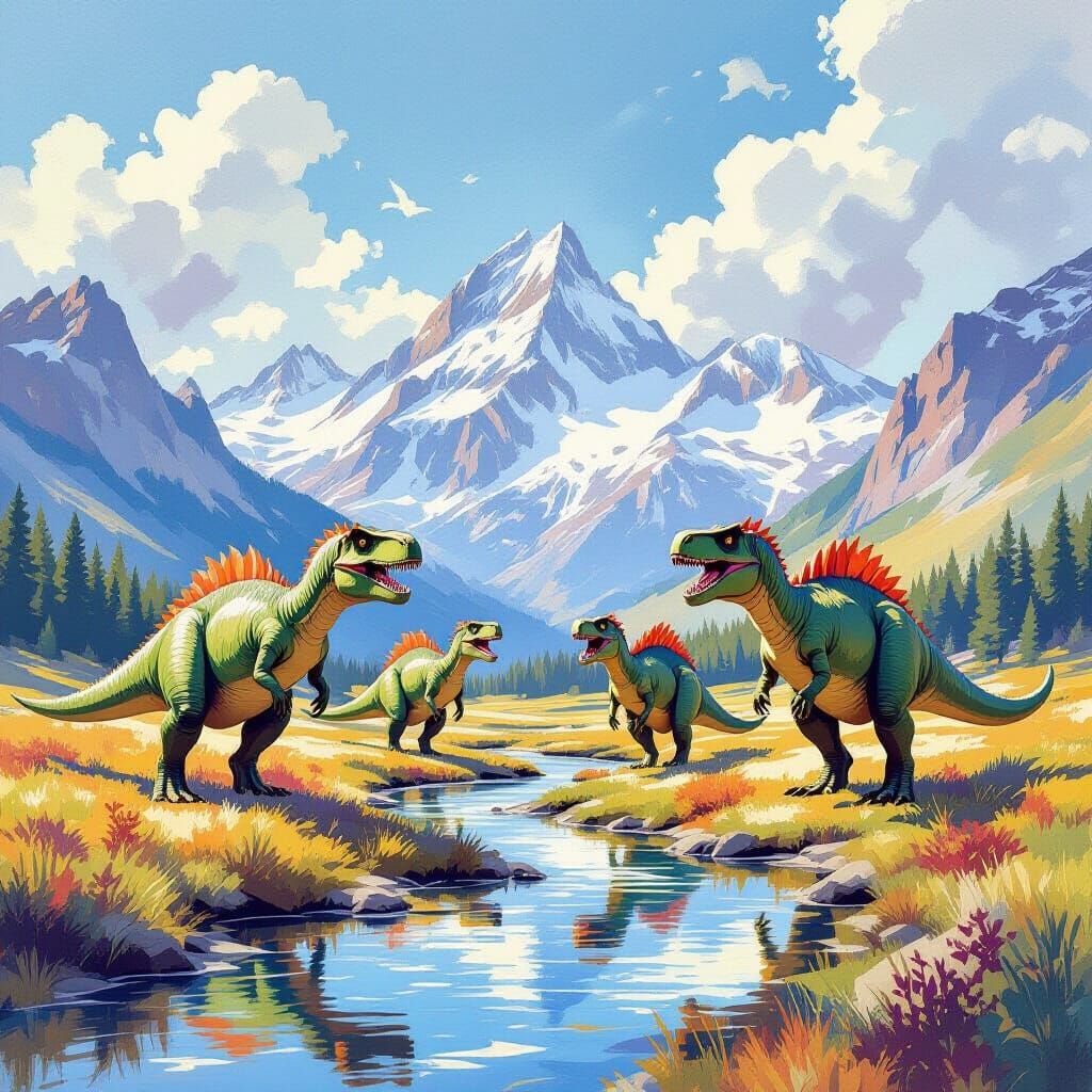 A striking picture of four dinosaurs in a peaceful plain with mountains in the background. The scene is rendered in a vibrant gouache style with thick brush strokes, similar to impressionist paintings.