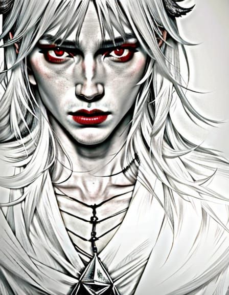 This image shows a frightening 25-year-old demon wielding a trapezohedron. The photorealistic, cinematic horror style features highly detailed white hair, pale skin, glowing red eyes, and ominous lighting.