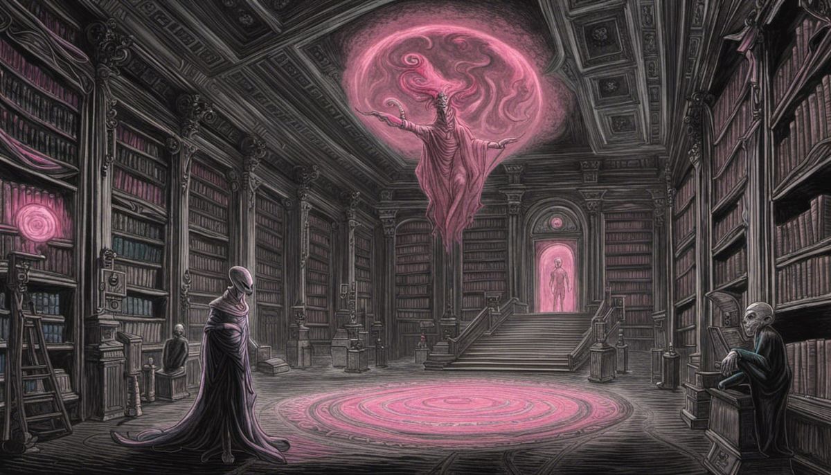 A haunting image of a three-eyed alien god in a Victorian library. The artwork features a synthwave aesthetic, with neon retro horror elements and a black, white, pink, and icy blue color palette.