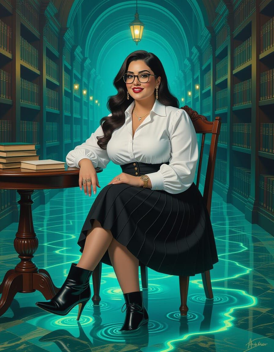This image shows a melting oil portrait of a curvy Egyptian woman with glasses, seated in a surreal library with bioluminescent granite floors and dreamlike lighting. The art style is reminiscent of Dali and Giger.