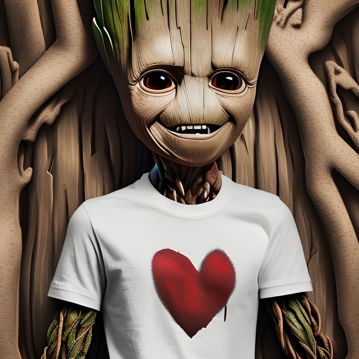 This image shows a smiling Groot in a white T-shirt with a heart. The portrait is a 3D digital rendering with intricate details and cinematic shading, in a Pixar animation style.