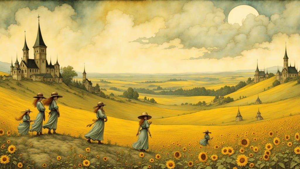 This enchanting image depicts a scene of villagers gathering sunflowers in a boundless golden field, surrounded by rustic charm and whimsical touches reminiscent of classic children's book illustrations.
