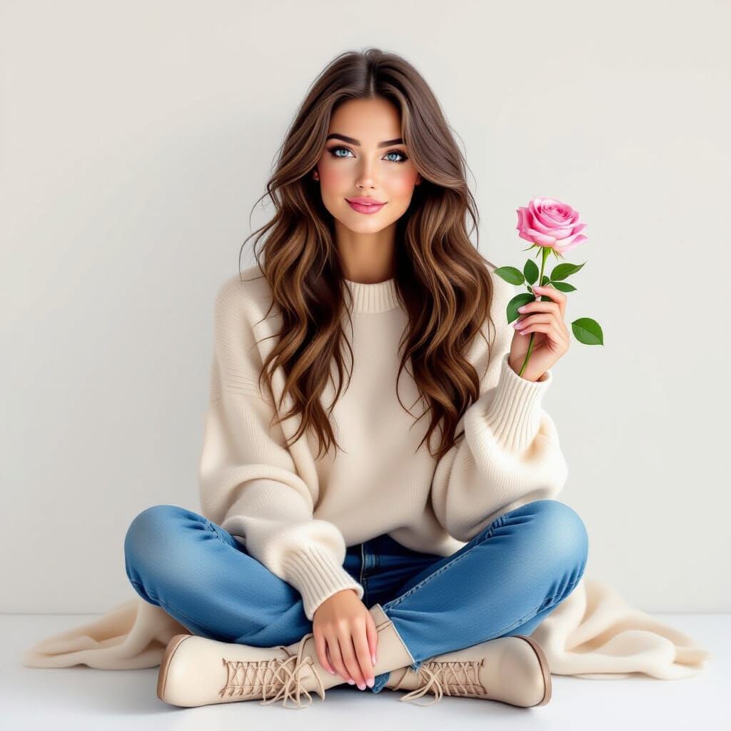 This image shows a beautiful young woman with long wavy brown hair and blue eyes sitting cross-legged, holding a pink rose. The artwork blends digital art, watercolor, and photorealism to create a serene, summery mood.