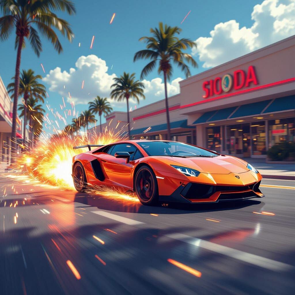 A dynamic side view captures a Lamborghini speeding and spinning, surrounded by sparks at a vintage Florida mall under a sunny sky. Features a stylized blend of futuristic neon and atmospheric lighting.