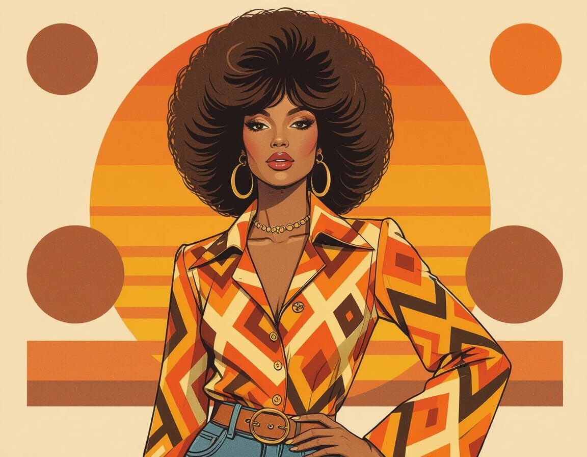This image showcases a confident model with feathered hair in a 1970s fashion ad style. Features bold geometric patterns, earthy tones, and a groovy, fashionable feel.