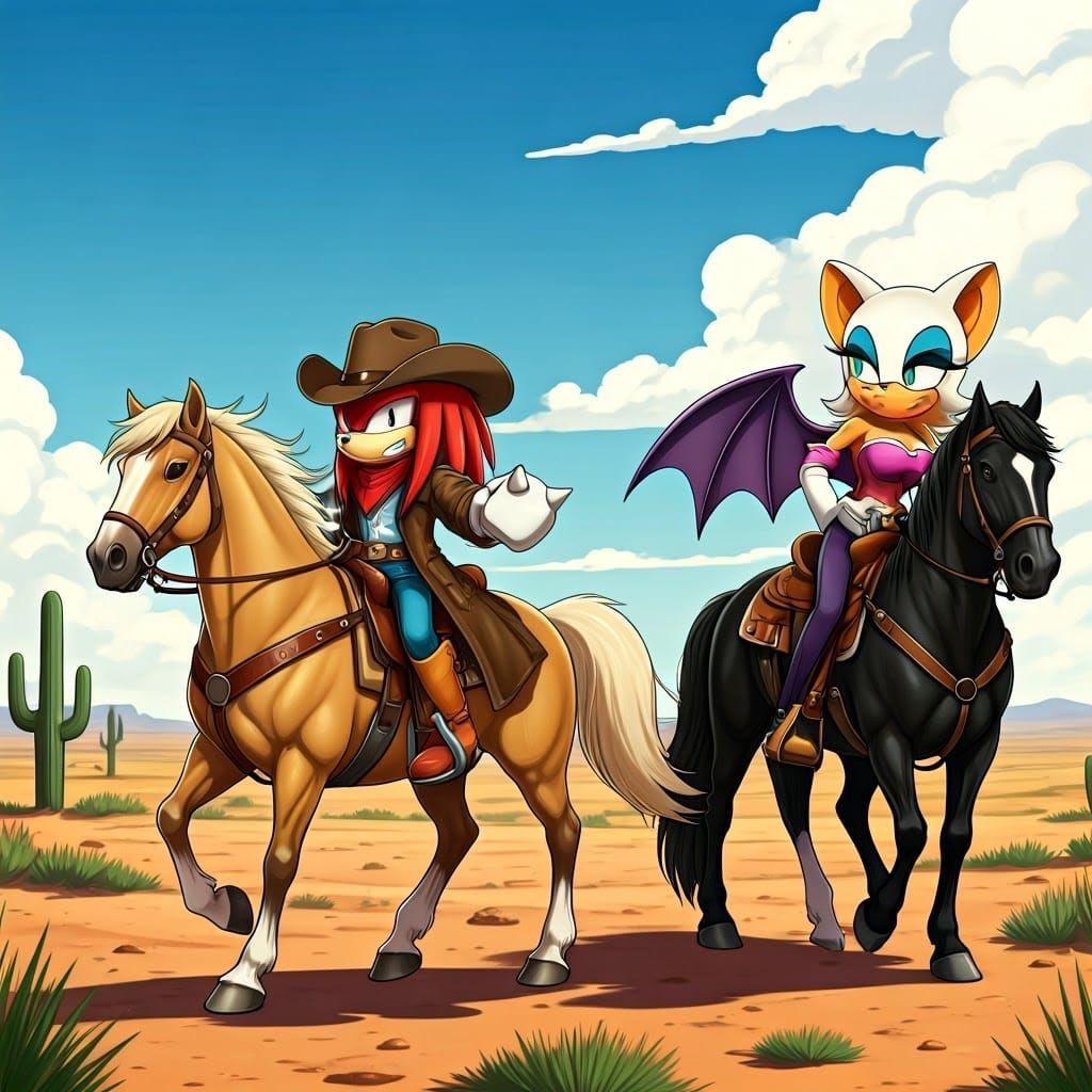 A dynamic painting of Knuckles and Rouge, dressed as Wild West outlaws, riding horses across the American midwest prairie, with a style that blends Frederic Remington's bold brushstrokes and classic Disney animation, set under a warm, golden sky with puffy white clouds.