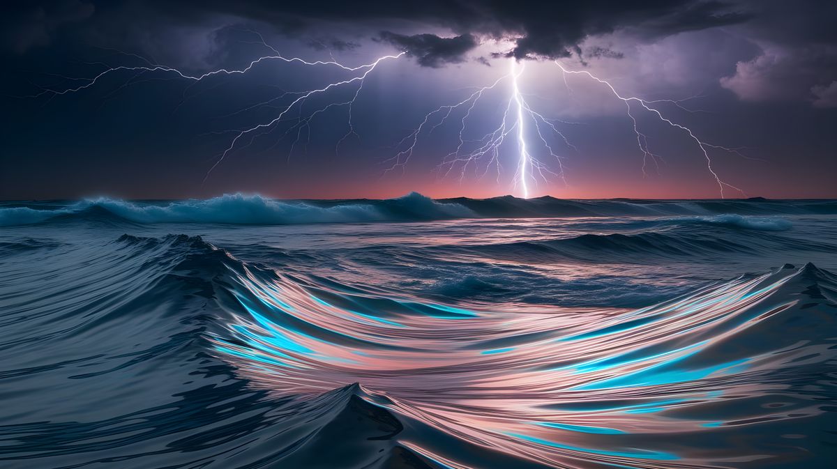 A highly detailed, panoramic photograph captures a powerful night storm with iridescent waves and swirling galaxy reflections. Volumetric lighting creates dramatic god rays across the tempestuous ocean.