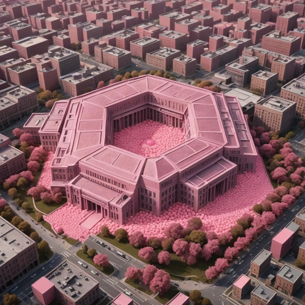 This image shows a close-up of a bubble gum version of The Pentagon in pink colors. The digital illustration is highly detailed with a cinematic, maximalist and atmospheric aesthetic.