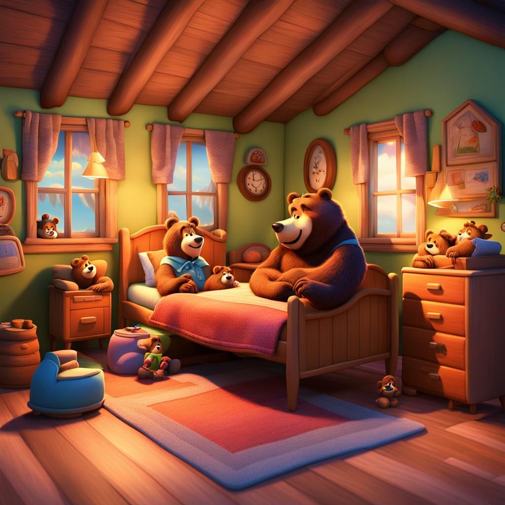 This image shows Yogi and Cindy Bear asleep near their children in a cottage. The image is bright and colorful 3D digital art with a cinematic feel and a radial gradient background.