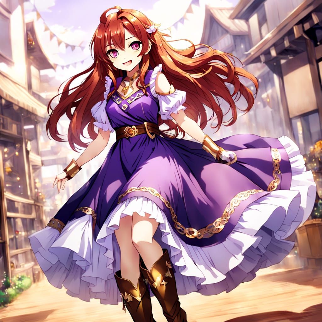 This image shows a young anime girl with fair skin, long brown and red hair, and striking silver eyes. She wears a beautiful purple dress and cowgirl boots, blending traditional and modern styles in a captivating scene.