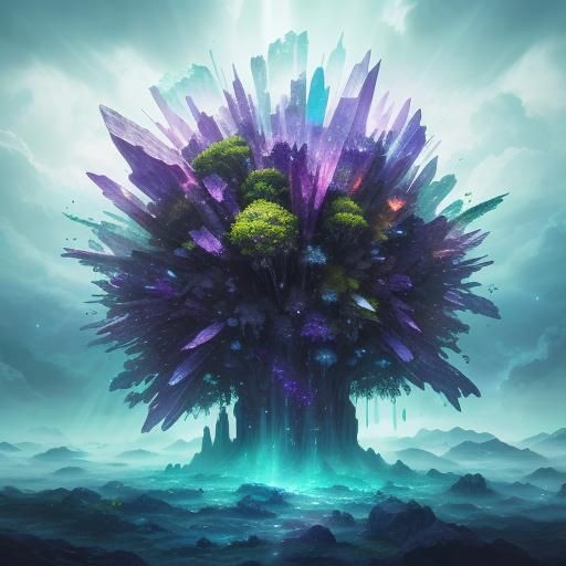 A close-up image of crystals bursting with green and purple plant life. This digital matte painting features vibrant colors and radiant light in a dreamy, cinematic style.