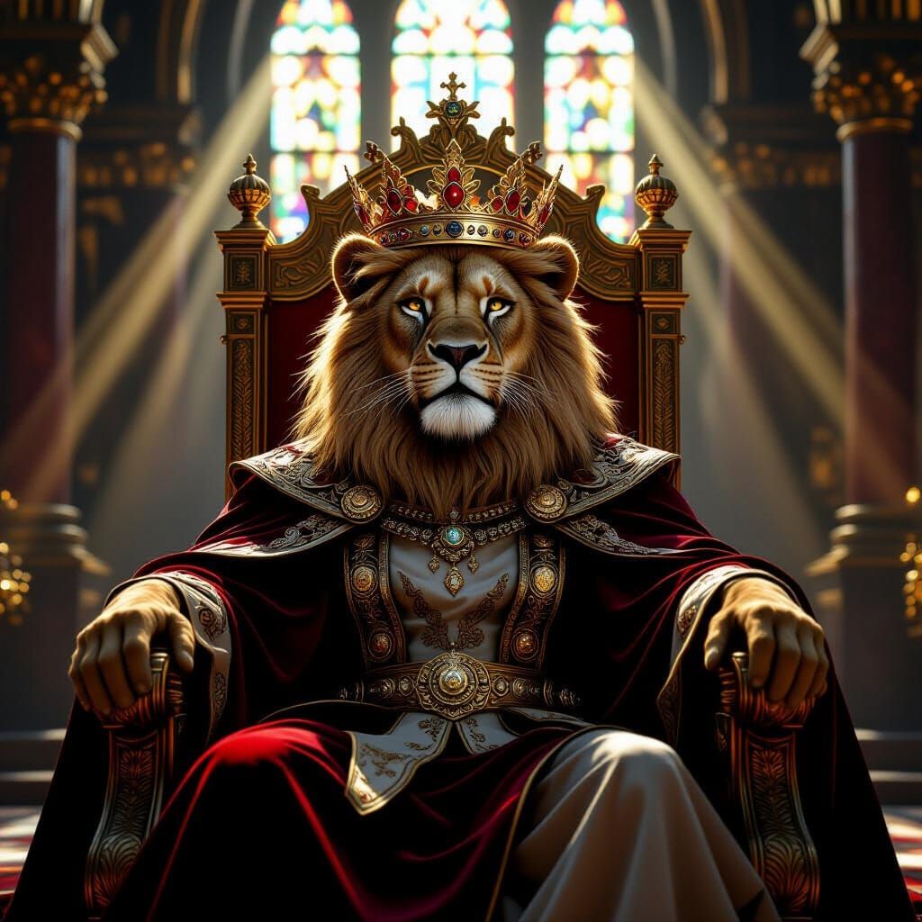 A hyperrealistic image shows an anthropomorphic lion with a golden crown and robes, seated on a throne. Light streams through stained glass in the lavish palace, creating dramatic illumination.