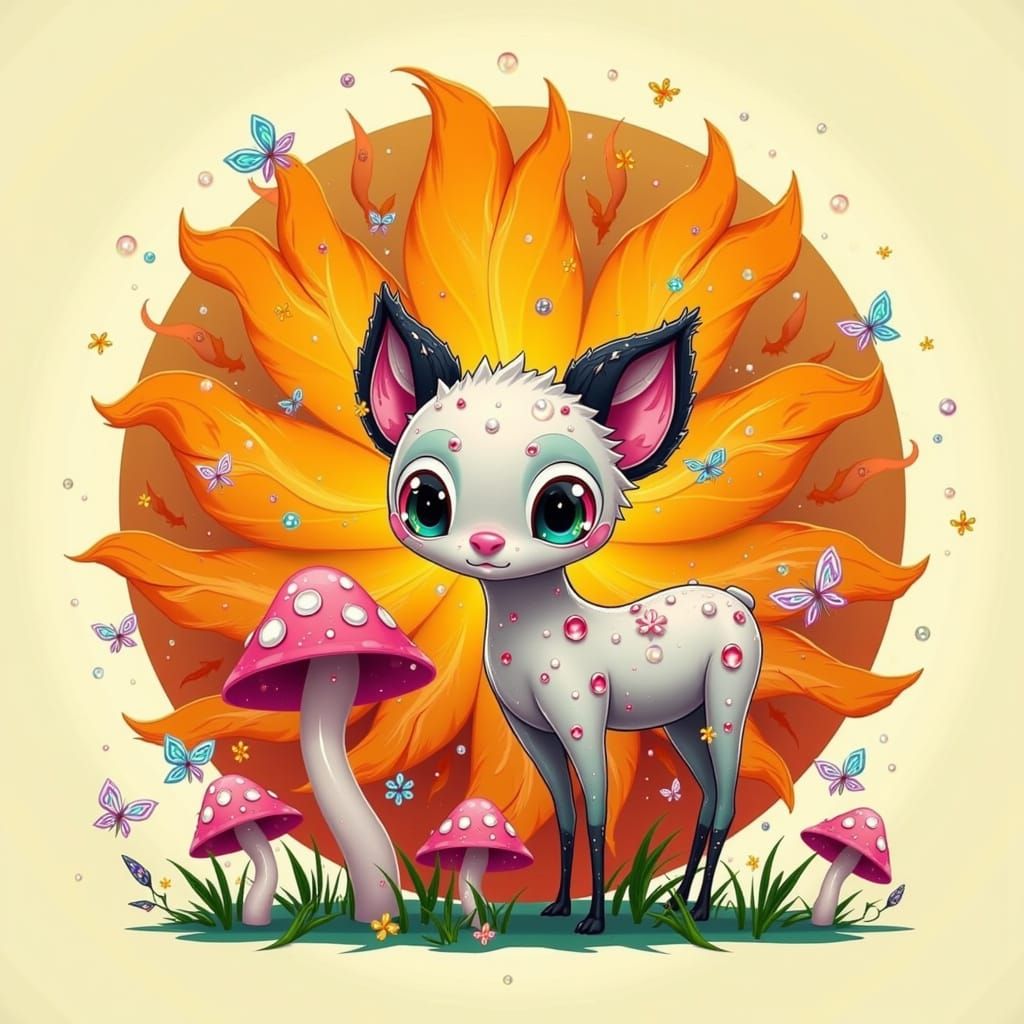 A vibrant image of a whimsical, large-eyed creature amidst glowing mushrooms and lush foliage. The fantastical scene is depicted with bold colors and intricate details, as a surreal digital artwork.