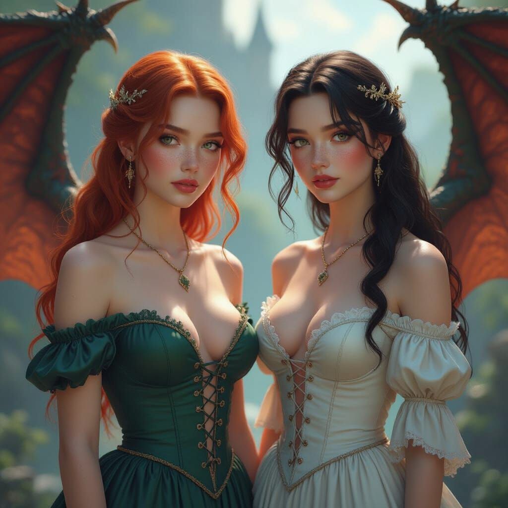 This image shows two fair-skinned, freckled princess sisters, recently freed from a dragon. One has red hair, the other dark. Realistic cinematic style with deep colors.