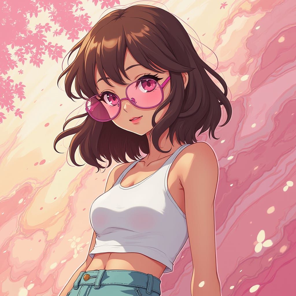 This image showcases a stylized anime girl with brown hair and light brown skin, wearing pink see-through glasses and a cropped top, set in a vibrant environment with bold lines, pastel colors, and dynamic textures.