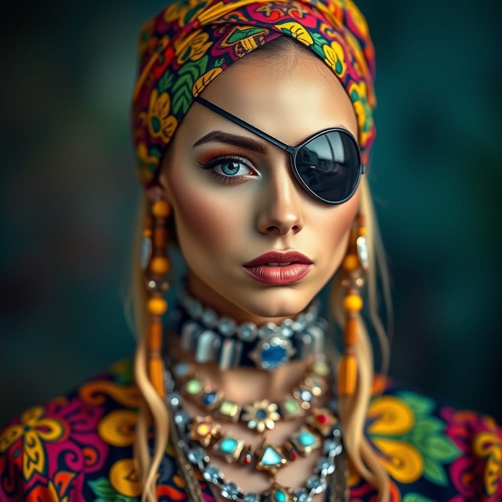 A hyperrealistic studio portrait of a woman with an eyepatch wearing bright, detailed clothing and jewelry. The image has a shallow depth of field and soft bokeh.