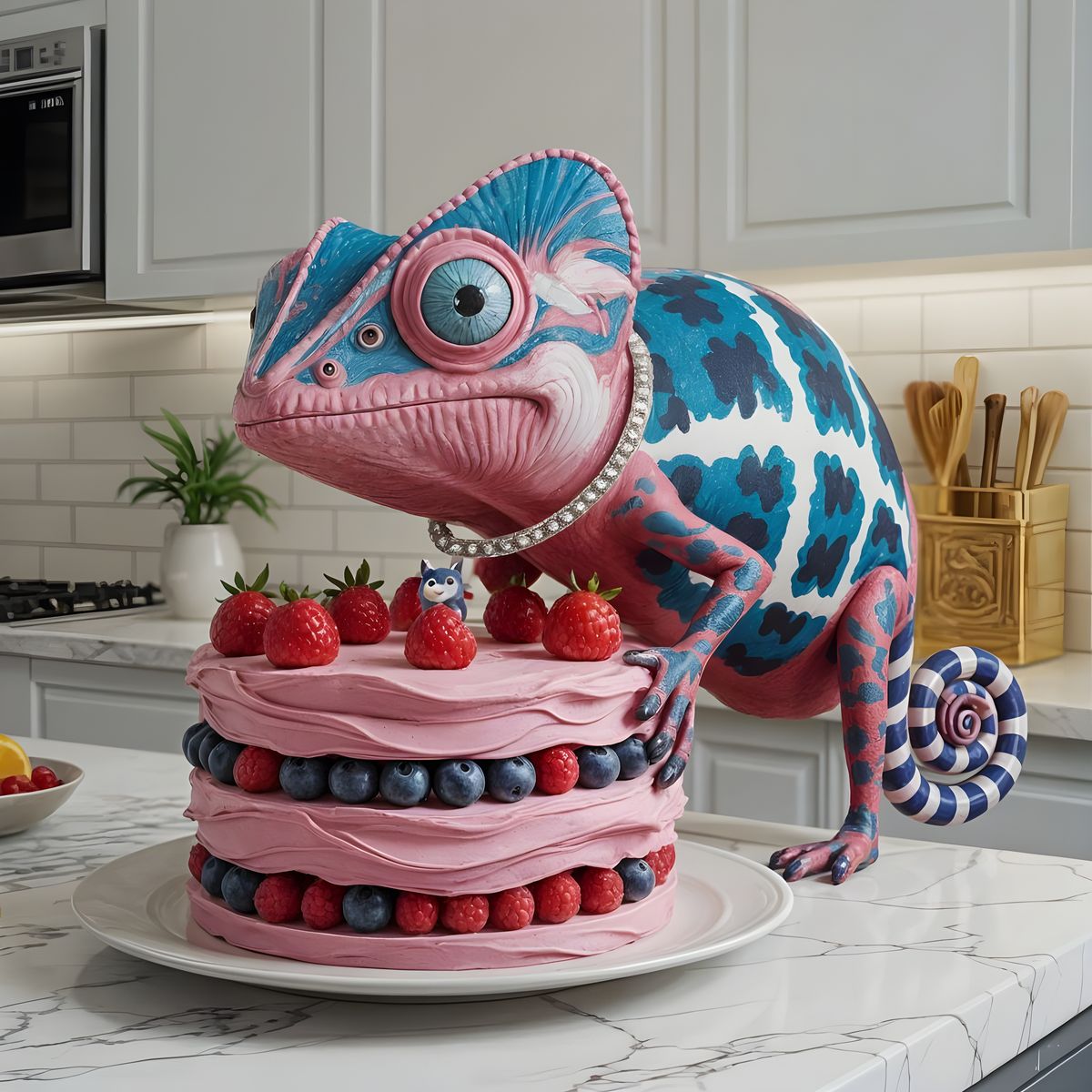 A charming 3D kameleon pet wears a diamond necklace while savoring a colorful berry cake in a modern kitchen, captured in a vibrant Gouache painting with thick brush strokes and textured layers