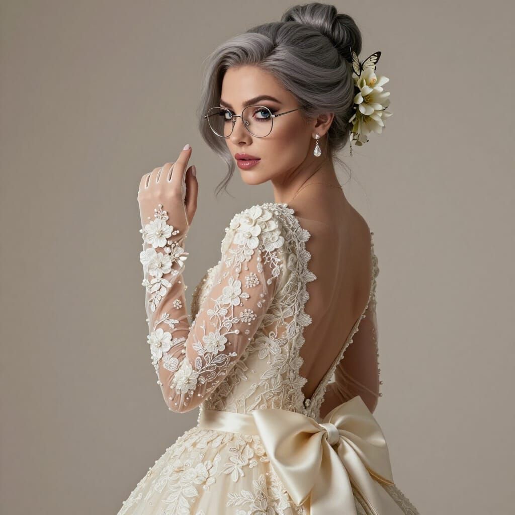 This hyperrealistic image shows a chic woman with grey hair and silver glasses, wearing an embroidered ivory gown and sheer gloves. Photorealistic style with ethereal lighting.