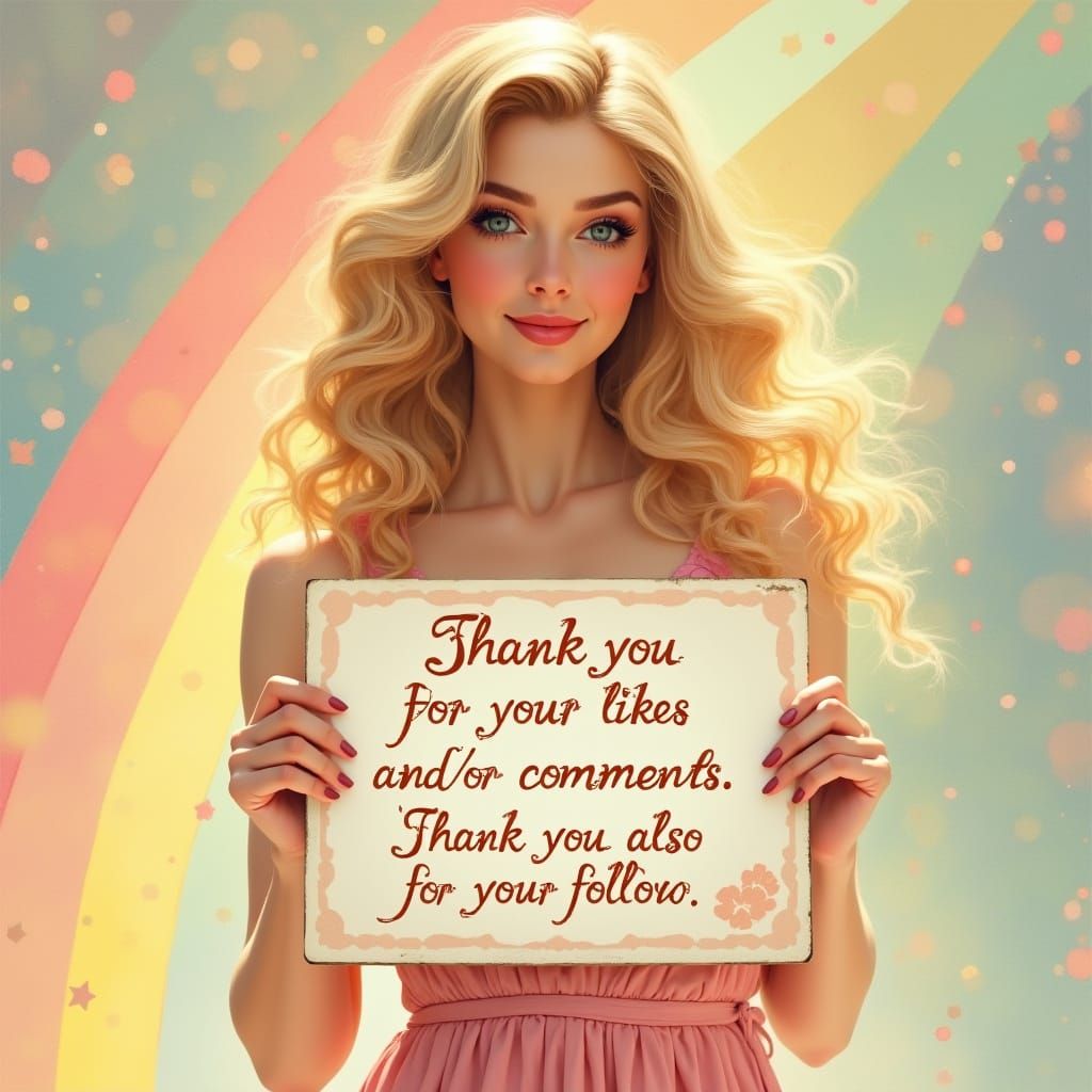 This image depicts a woman with wavy blond hair and a pale pink dress, standing on a light rainbow background, with a sign expressing gratitude in a delicate and vibrant style reminiscent of Art Nouveau and digital art.