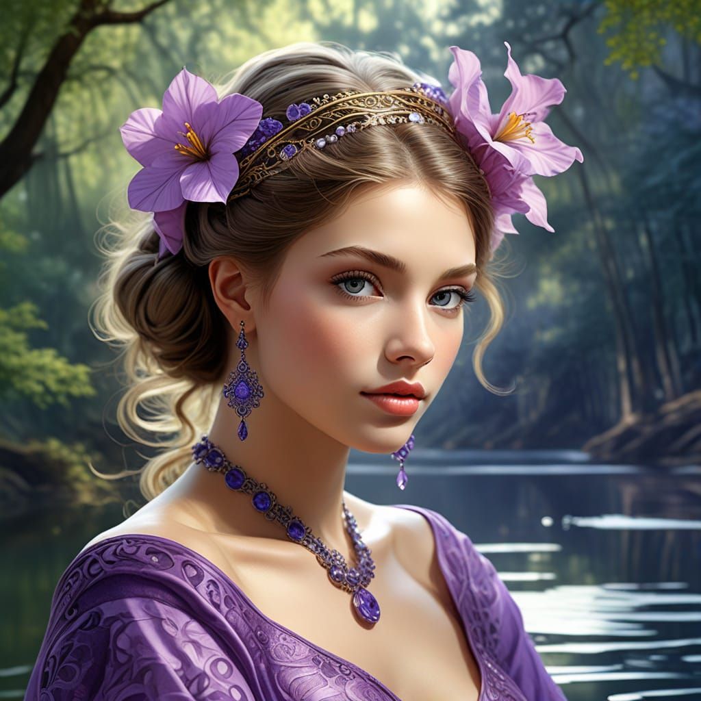 This image depicts a serene summer day by a tranquil lake, where a delicate maiden adorns a necklace amidst a beautiful forest of violets, blending traditional watercolor techniques with modern digital art elements in a mesmerizing abstract composition.