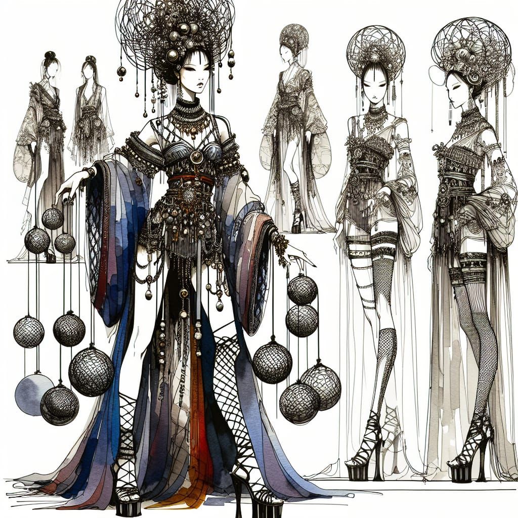 This image shows a model in extravagant Asian-Crete fusion fashion. The full-body outfit features medieval elements, ornate jewelry, netting, silk, ribbons, platform sandals, and an enormous hat, rendered in ink and watercolor.
