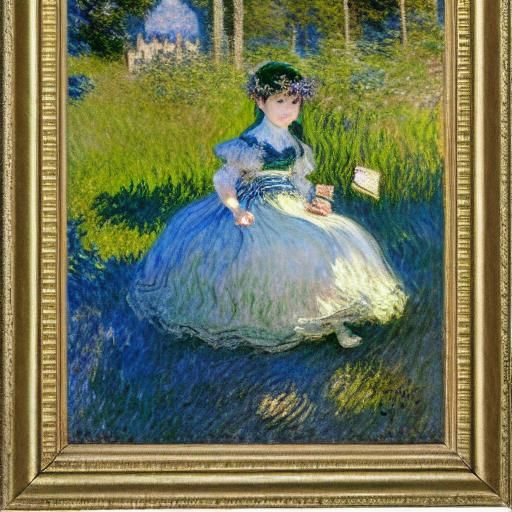 A fairy is writing in her diary in a garden. This image blends impressionistic painting techniques with mixed media and collage elements to create a colorful, dreamlike scene.