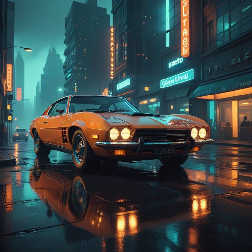 This cinematic film still captures a vintage car navigating a neon-drenched city. The illustration features futuristic architecture and a distinct orange color grading, evoking a film noir atmosphere with electric chrome details.