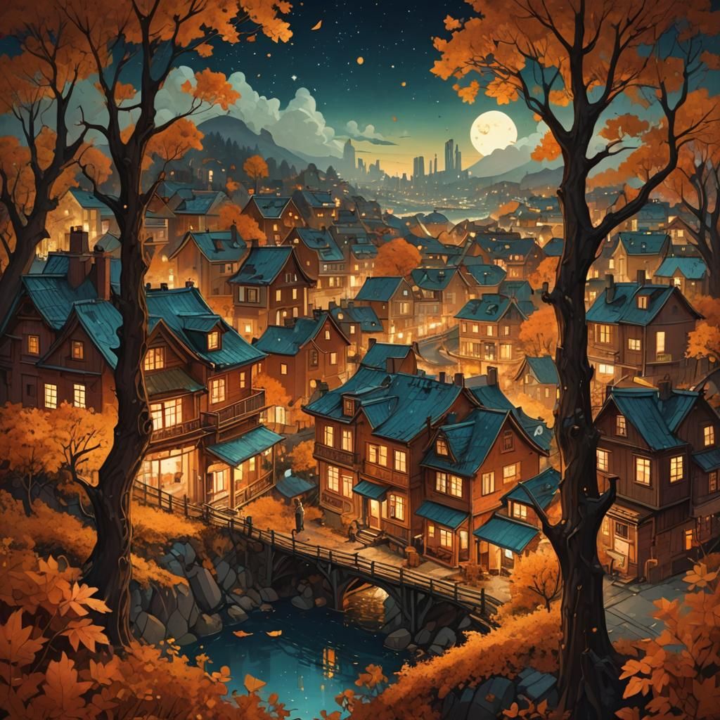 A hyperdetailed oil painting of an autumnal night scene. The artwork features vibrant colors and an amber glow, rendered with photorealistic detail as digital art.