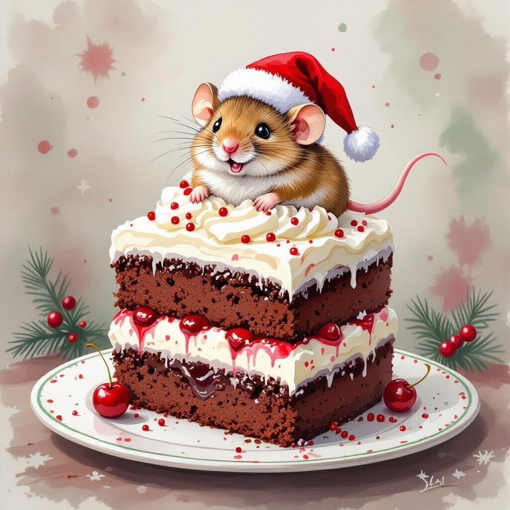 This image shows a whimsical watercolor sketch of a chocolate-cherry cake with cream cheese frosting and red sprinkles, featuring a happy mouse in a Santa hat. The Christmas theme is enhanced by a festive plate and background.