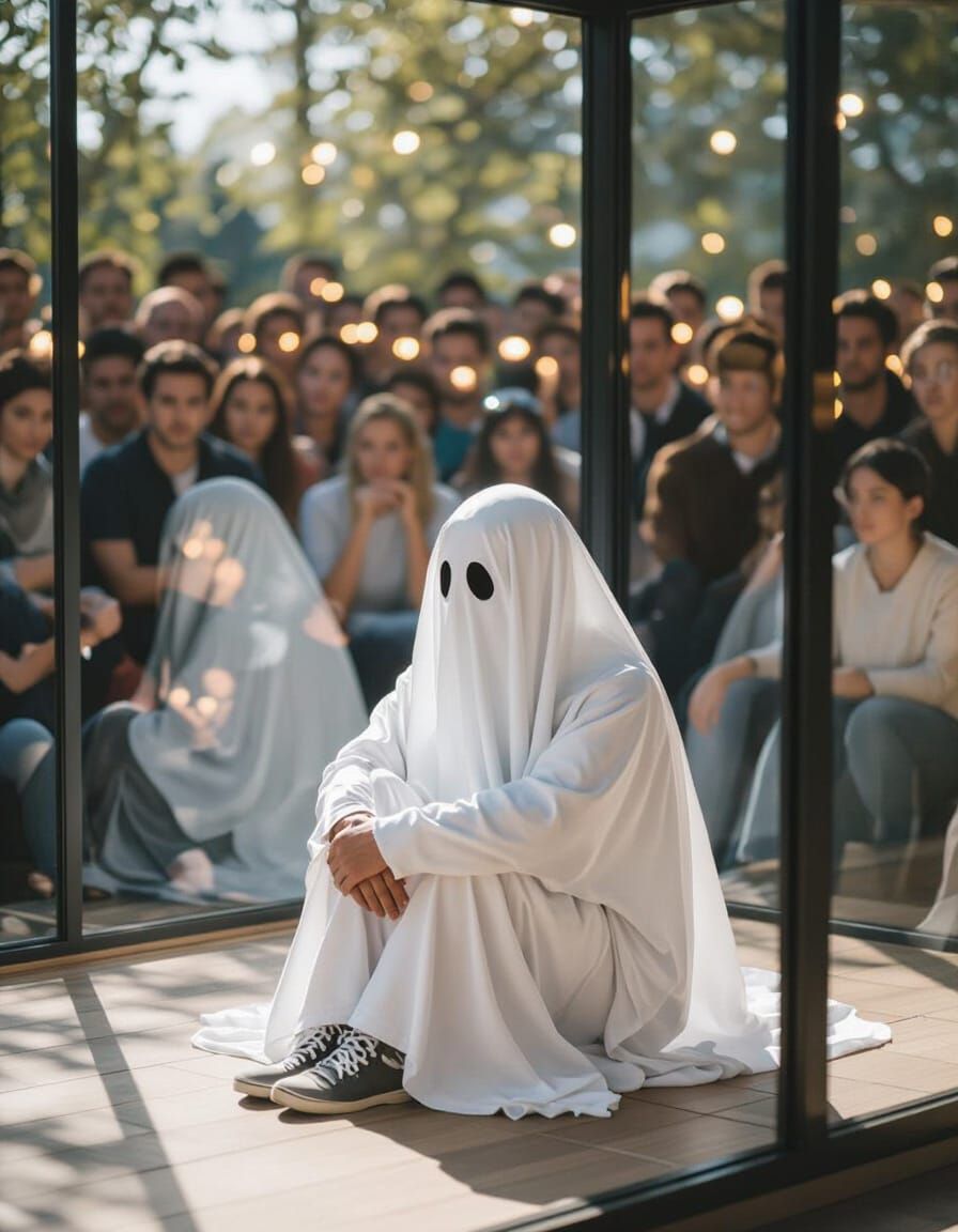 This image captures a person in a ghost costume sitting contemplatively inside a glass house, observed by an audience outdoors. A candid scene of observation and isolation.