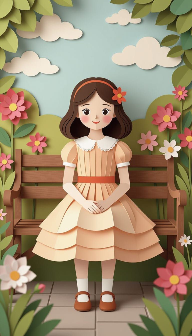 This image shows a 5-year-old girl constructed from layered paper textures, seated on a garden bench amidst paper flowers. The artwork features soft edges and dynamic lighting, reminiscent of paper cut collage.