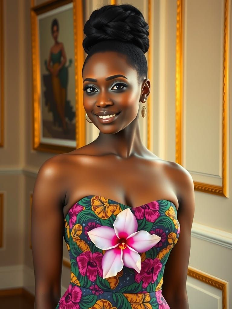 This photorealistic 4K portrait captures a beautiful Nigerian woman with a subtle smile. She wears a floral Kente bandeau dress adorned with a pink orchid, in a classic room with soft side lighting.